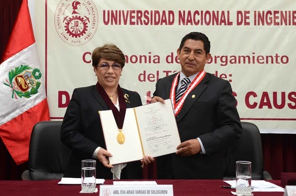 La distinción fue entregada en una ceremonia especial realizada en la sala de Sesiones del Consejo Universitario de la UNI, ahí participaron el Dr. Nelson Cacho Araujo, Secretario General de la UNI; y el M.Sc. Ing. Alberto Landauro Abanto, Decano de la Facultad de Ingeniería Geológica, Minera y Metalúrgica de la UNI. Cabe mencionar que esta facultad propuso a Eva Arias para esta alta distinción.
