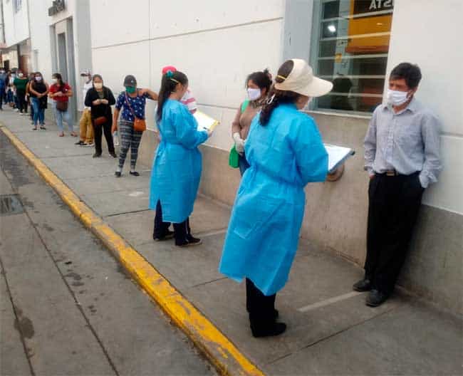 (Trujillo).- Continuando con su labor de responsabilidad social, la Universidad Nacional de Trujillo (UNT) a través de su Comisión de Prevención del COVID-19 viene realizando Vigilancia Epidemiológica Comunitaria en los ciudadanos y ciudadanas que concurren al Banco de la Nación del Centro Histórico de Trujillo, esto con la finalidad de identificar y notificar oportunamente casos sospechosos, probables y confirmados de coronavirus.