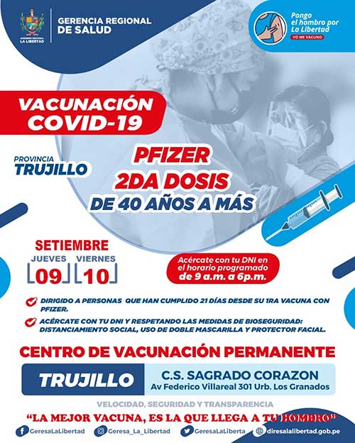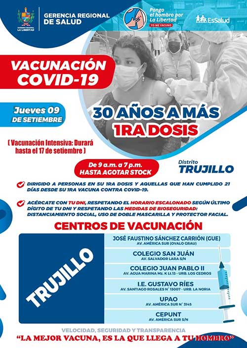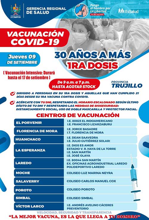 La Gerencia Regional de Salud de La Libertad, informa que este jueves 09 de setiembre continúa la vacunación de mayores de 30 años.