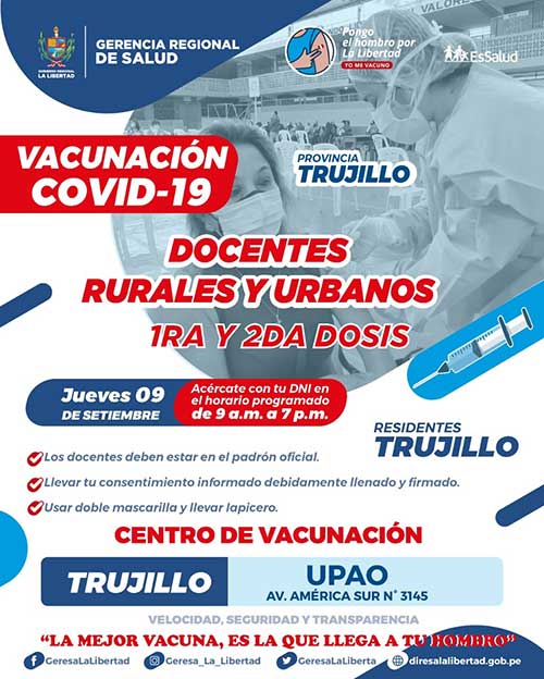 De igual forma los docentes rurales y urbanos, primera y segunda dosis , este jueves 09 en la UPAO. De 9 a.m. a 7 p.m.