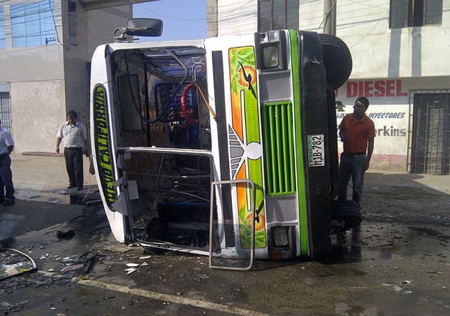 El exceso de velocidad habría causado que un microbus de la empresa Nueva California vuelque esta mañana y deje 20 personas graves. El fatídico hecho ocurrió a las 7:45 a.m., en la cuadra 17 de la avenida Túpac Amaru.