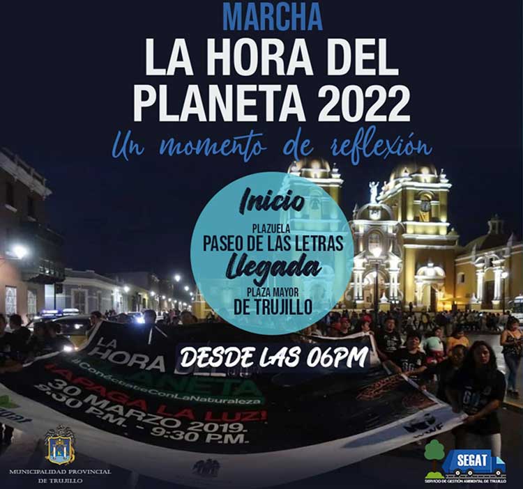 El planeta necesita un descanso. El Segat, luego de 3 años, realizará una nueva edición de La Hora del Planeta, en los exteriores de la Municipalidad Provincial de Trujillo (MPT), desde las 7:00 p.m., con el fin de concientizar a la población trujillana sobre la necesidad de reducir la emisión de CO2 a la atmósfera, más aún cuando este tipo de contaminación fue elevada en el 2021.
